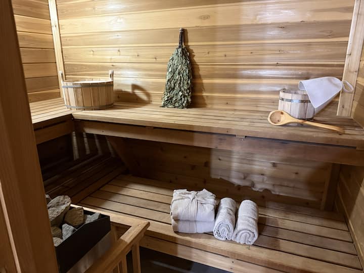 Stay at a spacious Bragg Creek vacation estate set on 17 private acres of forest. The property includes a large main house plus a fully equipped suite, up to 16 guests. Enjoy a chef’s kitchen, sauna, hot tub, billiards, karaoke, private trails, picnic areas, firepits, and a scenic pond with gazebo. Ideal for family vacations, group getaways, and retreats surrounded by nature. 10 min to Bragg Creek Hamlet (cafés, restaurants, shops), 40 min to Calgary, 1 hour to Canmore, 1.5 hour to Banff
